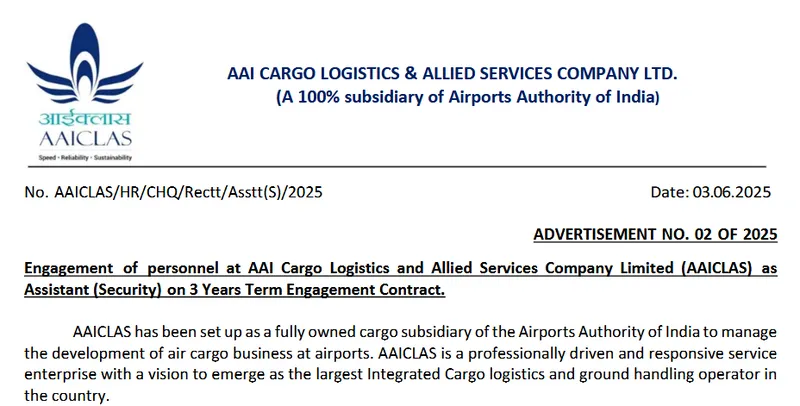 AAI Cargo Logistics and Allied Services Company Limited (AAICLAS) में Assistant (Security) के पद पर भर्ती निकली है। अगर आप 12वीं पास हो और एयरपोर्ट पर काम करना चाहते हो तो इस पदों के लिए अप्लाइ कर सकते है, लेकिन यह एक contract base पर होगी, पहले 3 साल का कॉन्ट्रैक्ट मिलेगा।